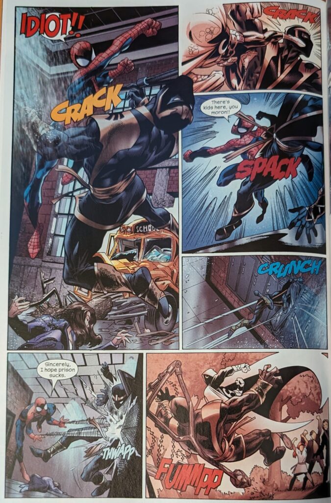 Well, crazypants Moon Knight crashes a bus right through the front of the school, as the little girl in his head demands to know what he’s doing. And then Ronin is out of the bus, shooting an uzi in the air and demanding Spider-Man appear. The little girl in his head tells him he’s gone too far as someone off-panel says “I guess I should thank you for this.”