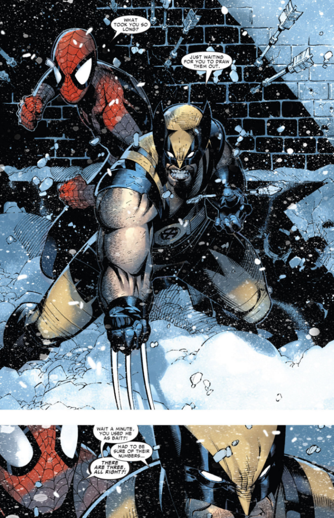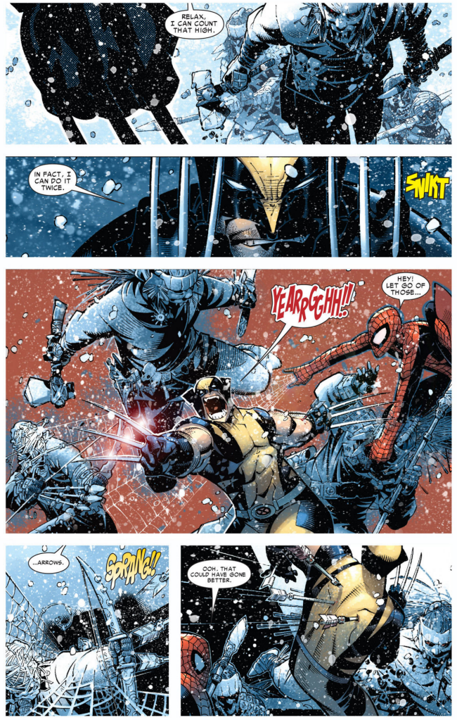 So now we’re back to the opening bit. Spider-Man’s trying to get his gear and set up his camera when Wolverine prevents him from being shot with an arrow by letting it get him in the forearm, instead. I dunno, man, just because you can shrug that kinda thing off doesn’t seem like it would mean you’d do it on purpose. It still hurts!