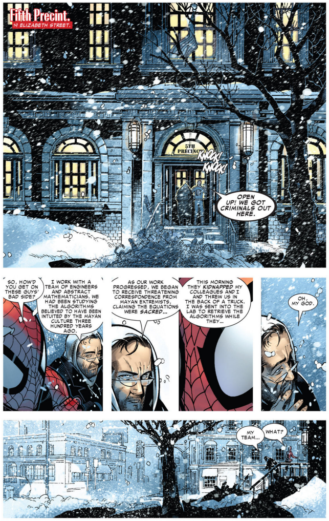 So, then, we find Spider-Man waiting for Wolverine later, freezing, making a joke about how he remembers how bad a blue hoodie looks over his outfit so he can’t wear a jacket, when he sees a guy who seems to fit Strange’s prophecy, which said someone would be fleeing baddies with red eyes. Sure enough, 2 white men are following him. Like, really white.