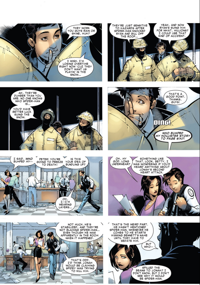 I like this exchange between Logan and Peter. Oh hey, at least we don’t have to deal with surprisingly high rate of Spider-Man writers making Wolverine a massive jerk for no reason pre-OMD anymore, I guess that’s nice. I wonder how often the Avengers appear in this title now. It’s weird not to know! All this being new to me. The late 80s, 90s, half the 2000s, I’d read some or all of the Spider-Man material. It’s been a long time since I hit a block full of stuff I did not know. Years! And now it’s gonna happen all the time! not knowing is fun, even if the hit rate has been prrrrrrretty bad so far. Well, anyway, after reiterating his belief that he can handle his own solo career, Spidey mentions he’s got to travel 20 blocks in this blizzard. Strange says he can’t make it go away, but he might be able to magically tell when it will end. Instead, he discovers the blizzard is not natural, says a bunch of mysterious magic stuff, ending with “a protector fights to seal the lock, right here, tonight, at four o’clock,” and then passes out. Wong is weirdly not panicked by this, saying asking some questions exacts a heavy toll. But Logan and Spider-Man decide they’ll be at the place where the “sealing of the lock” is to happen at 4. Meantime, Spide-rMan heads to the Bugle, er, DB!, where 2 guys working on the roof are packing it in due to the weather. He changes clothes out of sight and then gives a lame excuse about “needing some air” as he gets in the elevator with them.