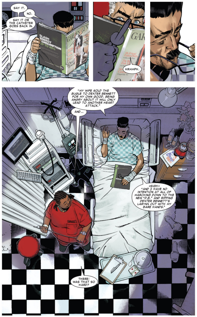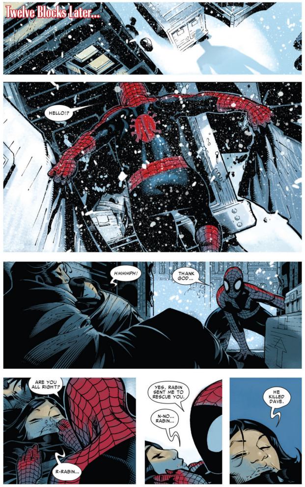 JJJ thanks the nurse for helping him see the light, waits til she leaves, then tries to march out into the blizzard without so much as shoes before being forcibly dragged back inside. Which is pretty JJJ, but him doing it in the hospital gown and no shoes, I don’t buy for a second. He’s not stupid, he’s just stubborn. We cut to an increasingly frozen Spider-Man trying to travel across an increasingly frozen city, then to the 5th Precinct…