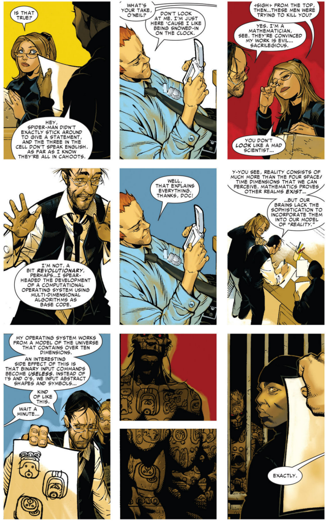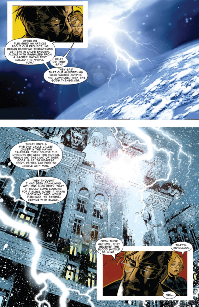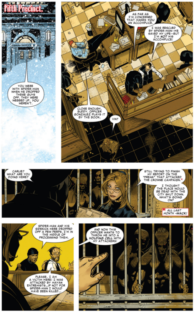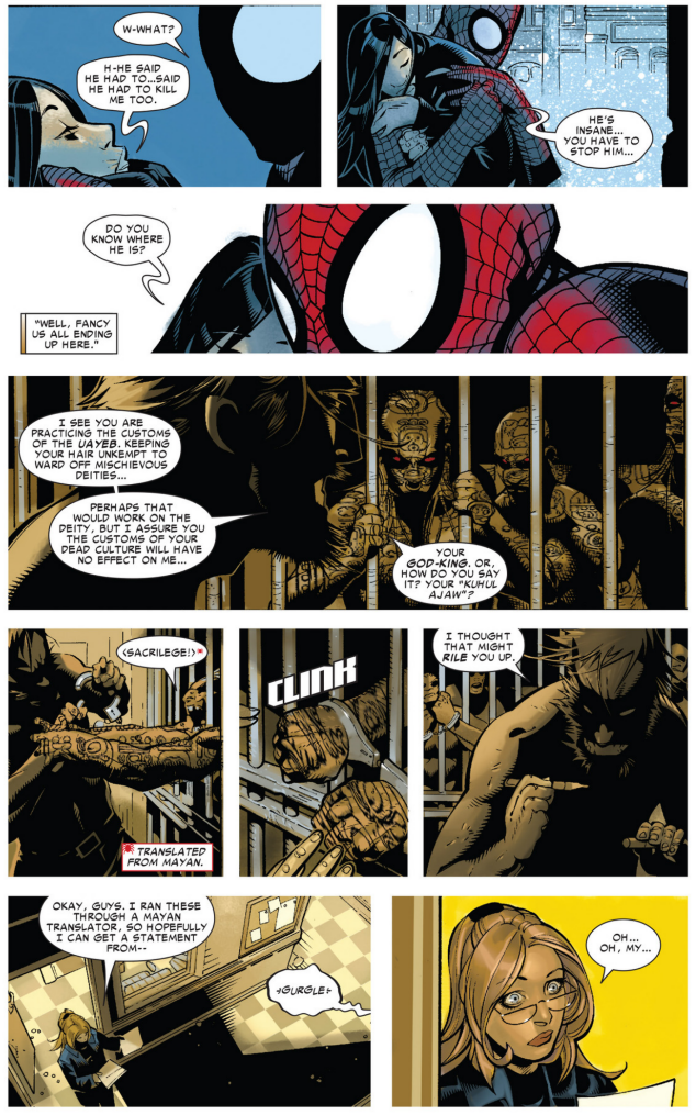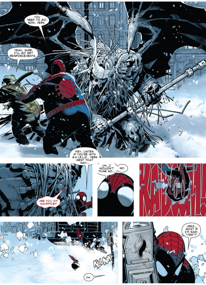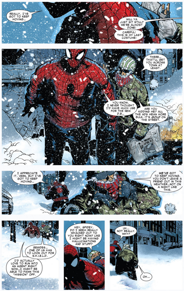 So, at this point, the first time I read this, I had to start looking things up. This is comics, after all, with a long and sad history of just making up “ancient traditions” of real people. And I don’t know if Wells was trying to obfuscate a little or what, but he spelled everything wrong. There’s a Mayan text called the Popol Vuh, not “Popul Voh.” This 5-pday period (at the end of the Mayan year) exists, but it’s called Uayeb or Wayeb, not “Uayep.” There exists a the Mayan term K’ujul ajaw, meaning “divine lord,” but he left out the apostrophe. So is he spelling it wrong on purpose to try to give himself some wiggle room vis a vis historical accuracy, or is he just bad at Google? I guess we’ll never know. Either way, this whole thing is deeply awkward. Well, while that guy’s info dumping, Spider-Man has more or less gotten so cold he literally can’t proceed, and finds himself in an alley with a guy with Ye Olde New York Barrel Fire going, who thinks SHIELD is after him, and is invited to warm up.