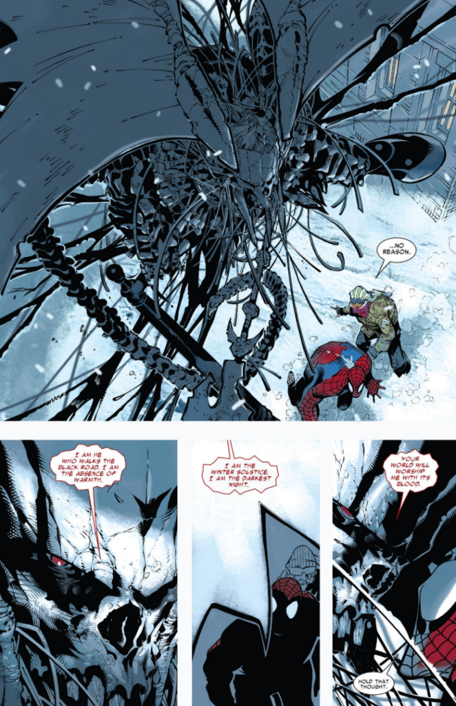 I’m sure this is all very authentic. Spider-Man rips a parking meter out of the ground as a weapon, and big guy there picks up a whole semi truck as his own club. After nearly being smashed, Spider-Man is told he “carries the sun-blood” and is not the sacrifice. Asked if he’s a priest, while being smooshed, he says yes, and the thing flies away. Spider-Man decides to just press on and pretend that didn’t happen, as the thing follow him from above.