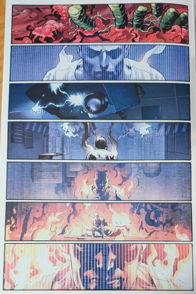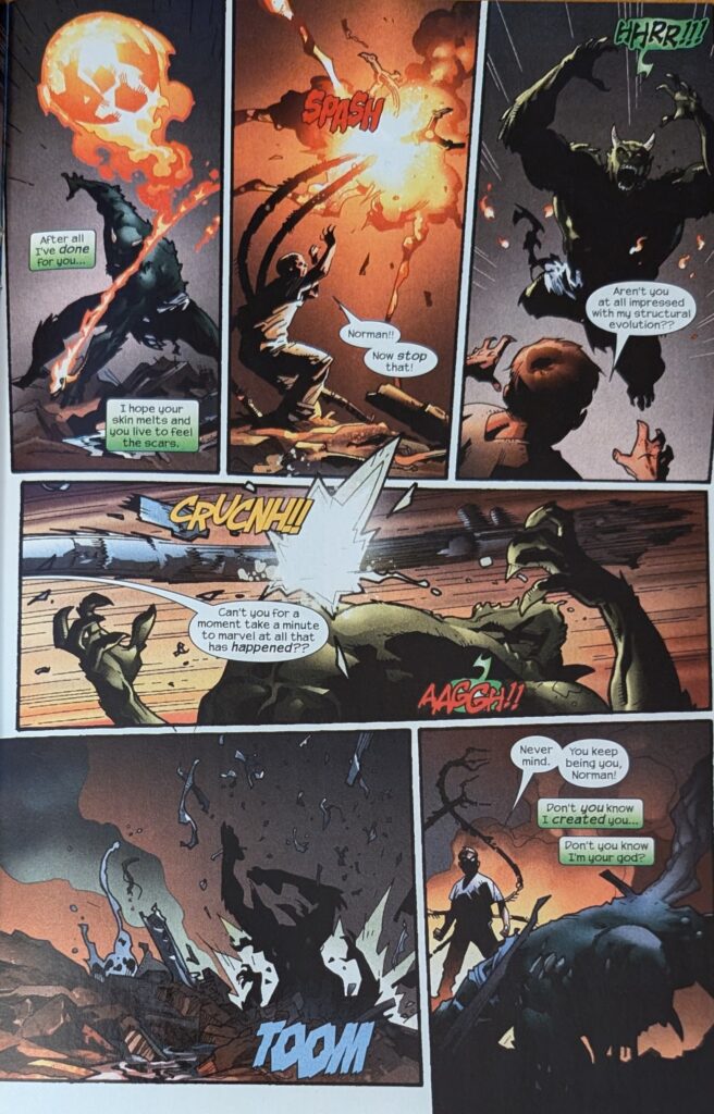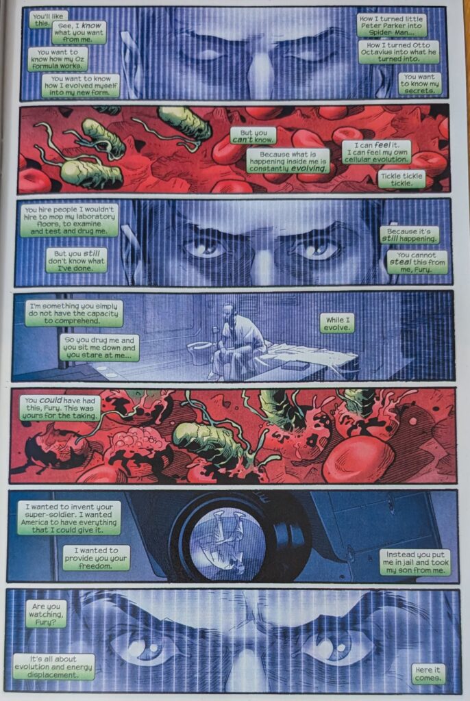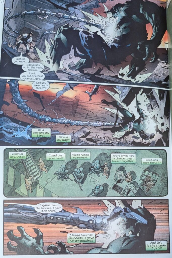 So he blows up the basement, seemingly just by wanting to, like Nitro or something. Partially obscured but now in Goblin mode, he stalks out of his cell and immolates a guard, still ranting internally at Fury, as we see other inmates are loose, too, like Kraven and Omega Red… and the Gwen Stacy clone. Thought we forgot about her in the aftermath of the clone saga, eh? We did not. She walks out in silence as Norman’s monologue is interrupted by the appearance of Doc Ock, who has made arms out of what’s at hand, like he apparently can. Ock tells Norman he looks well.