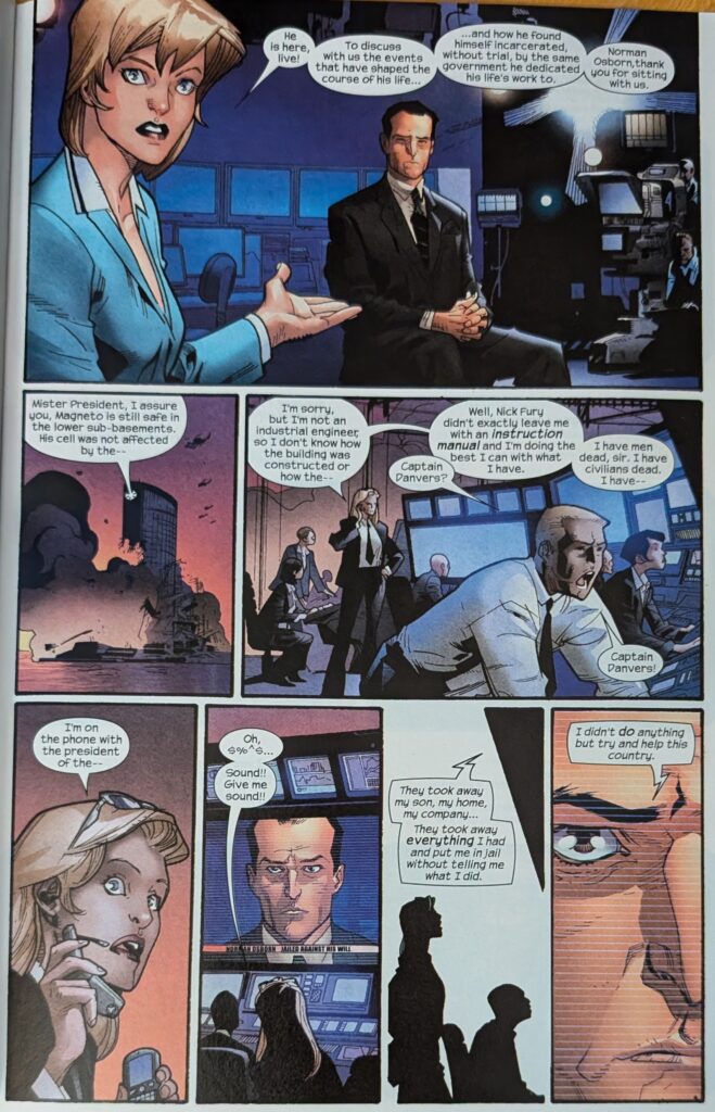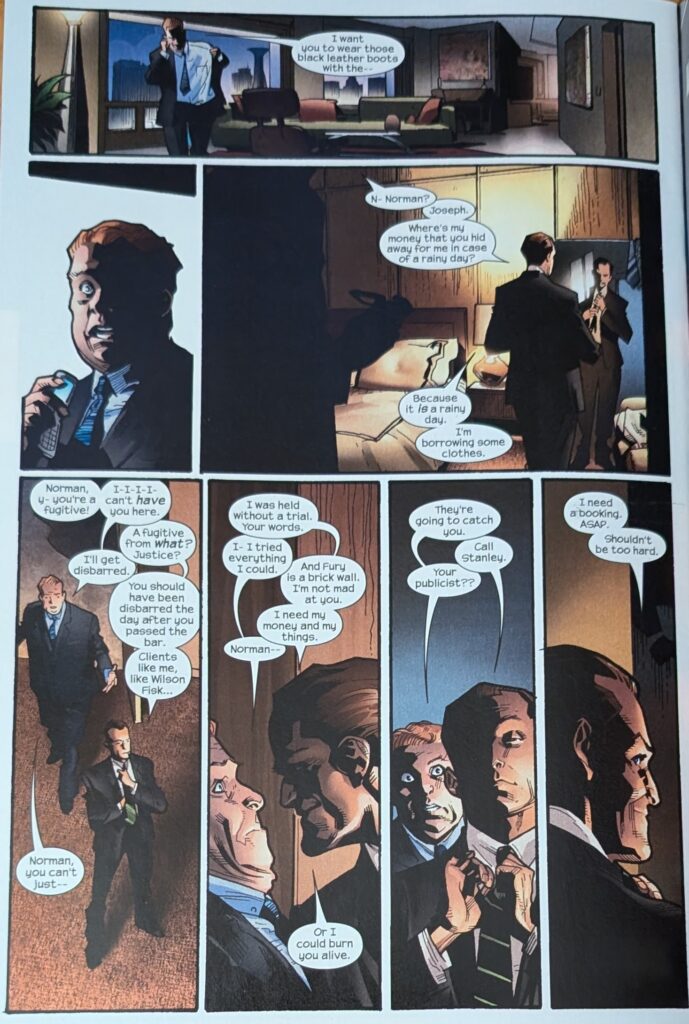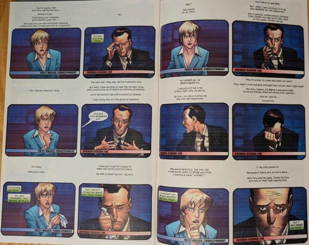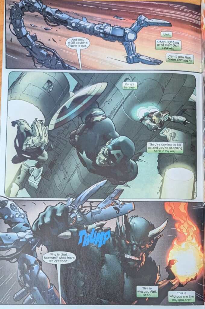 This month, as we have done before way back in USM 25, we play back through a scene involving Norman Osborn with his internal monologue over top of it. This time, instead of crazy lil imps in his head, it’s him threatening Nick Fury in his mind over Carol Danvers making a face at him and leaving last issue, thinking he wants Fury to be absolutely sure he’s done everything in his power to stop Norman, and now he will destroy Fury.