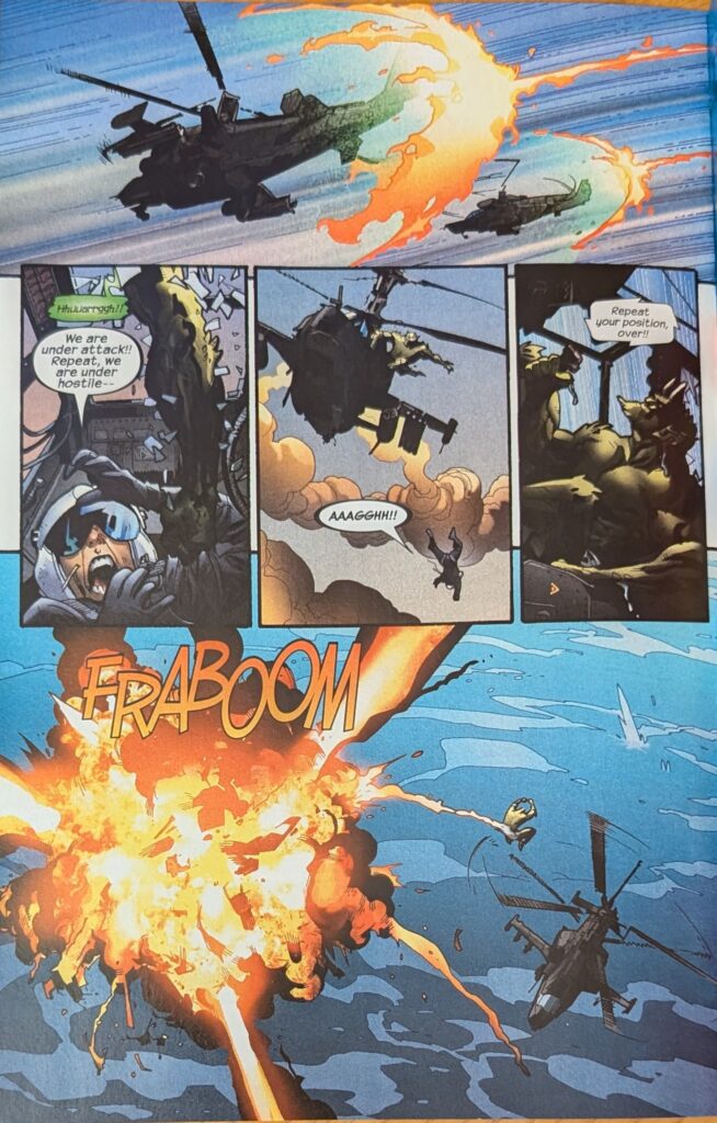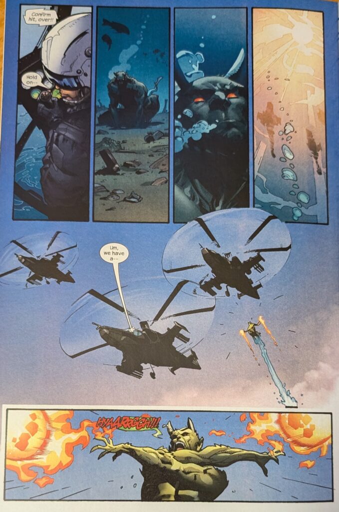 “Can’t you for a moment take a minute” is an odd turn of phrase. VERY heroic Ultimates, there. Electro appears and zaps Doc Ock unconscious. Fury is kind of an idiot. I mean, not to take Osborn’s side, but, like, keeping all these people in this place, AFTER they all busted out that one time, is insane. At least have TWO facilities, if not one for every one of these weirdos. Electro says he did this because he wants work on the outside. Norman says he’ll have it, but thinks he’s insane. Electro flies away. Norman flies away, too, which is apparently something he can do now, only to be shot down by some helicopters and disappear into the ocean.