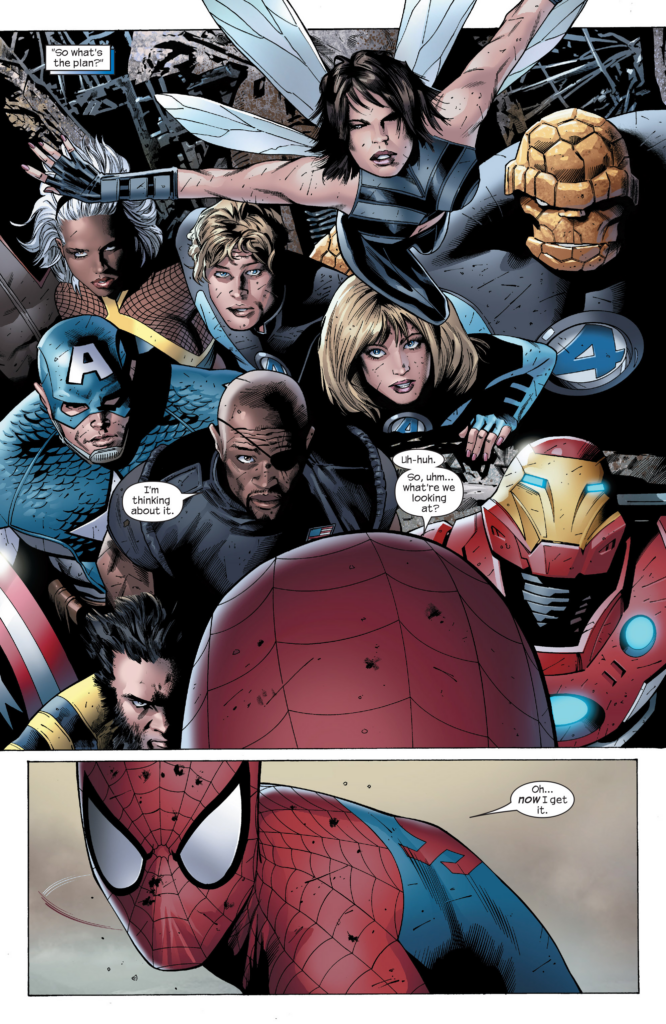 Ok, first THREE pages, my goodness! Get ON with it! Spider-Man spends an entire page getting out his idea to have Thor use his hammer to track Reed’s energy trail. Then there’s a page of everyone (Literally everyone) saying Spider-Man is right, and then Nick saying they’ll still need the helicarrier, so he was actually right. WHAT IS THIS? I get the feeling this is JMS doing a Bendis impression, and it is very unflattering. Then there’s a splash page of Thor flying with the helicarrier. There’s been, like, 3 panels’ worth of story in the first 8 pages of this comic.