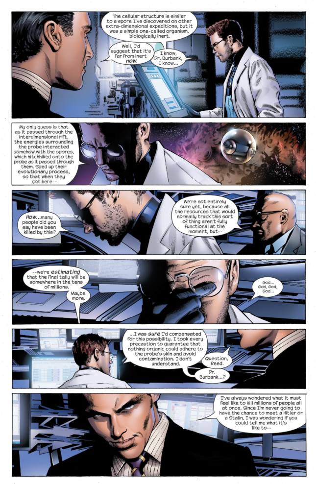 What even is that 2nd panel? This comic is a waste of money. I mean, not mine, but whoever was foolish enough to buy it back in the day. In a 2-page splash, Thor opens the portal, then a 1-page splash shows him and the carrier flying through it. I am truly amazed by how little you’re getting for your money in this comic. It reads like they decided on the gimmick of 3 writers writing 3 issues each and then JMS couldn’t think of enough stuff for his. JMS now finally gets to the characters he created, who being speculating that the Ultimate heroes could follow them over the previous splash.