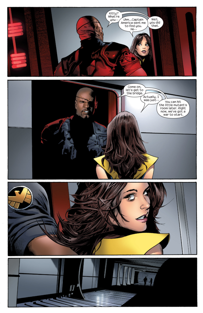 Is that guy a bad guy? Like all he’s doing is delaying the possibility of a solution. Back on the helicarrier, everyone’s looking for Fury and can’t find him. Kitty Pryde randomly walking down a hallway says she saw where he went, and goes to get him.
