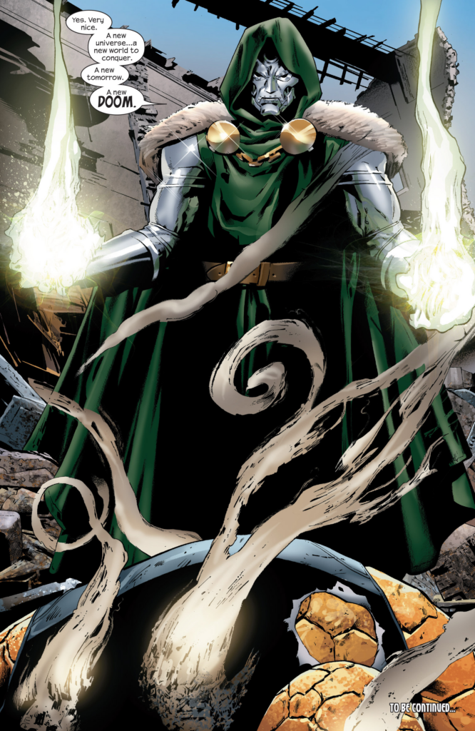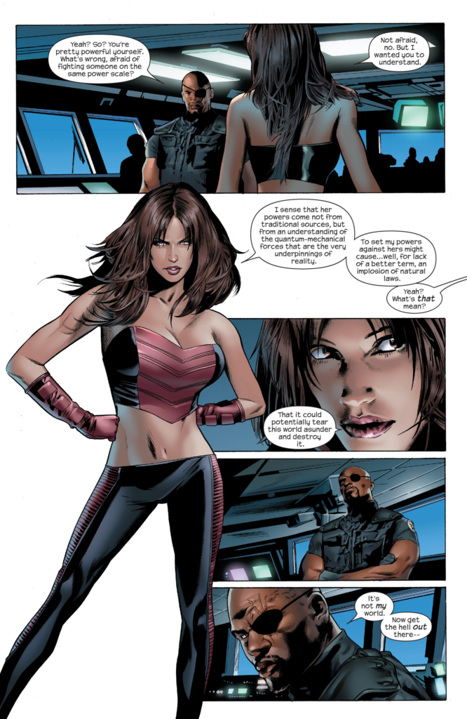 Ultimate Dr. Doom was introduced as a goat-legged homeless guy who’s main weapon was an army of robot bugs, in the long string of mistakes that was the early years of Ultimate FF. When Mark Millar and Greg Land took over the title, job one was turning Doom into Doom, albeit most of the drawings were pictures of the same statue. Comically lazy, Greg Land. Well, there he is. We’re 2/3 of the way through, we need something for both sides to team up against, and we got it. Now it’s up to Jeph Loeb to take us home. I’m kinda surprised Strakzynski got the middle bit. Loeb is (I think) the writer on Ultimates at this moment, and Supreme Power is JMS’s baby. Kinda feels like they should get the meaty bits, and the middle is always the least interesting. Ah, well. No hope of this ending in a satisfying manner, but we’re almost there…