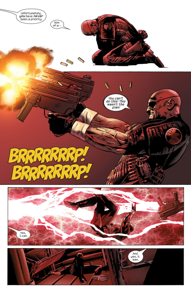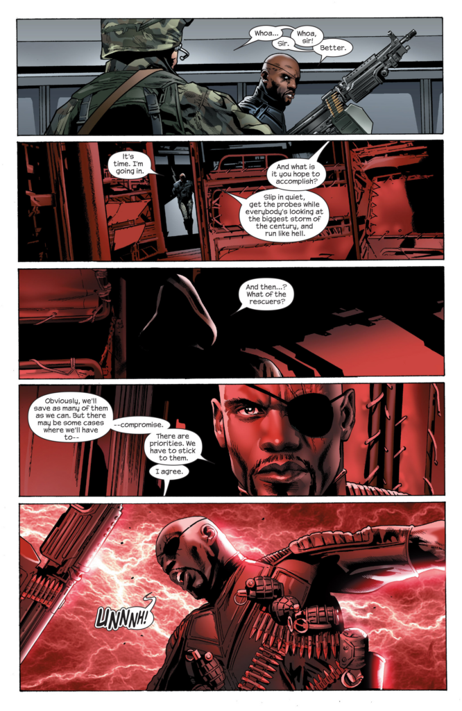 Who has double crossed Nick? Why, that’s 2 double crosses in a single issue, JMS is finally putting in some effort. SHIELD goons run in and shoot at the mystery guy, but get zapped by obvious Photoshop lightning just like Nick did (Takes one to know one, in the case of this lightning). Zappy also breaks up the fight between the speedsters and steps on Wasp and Not Captain Atom. I have to run this page for how terrible it is: