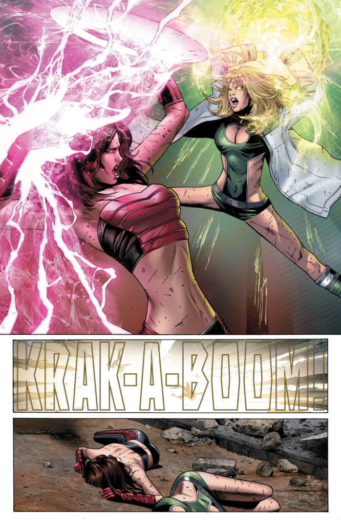 It’s funny. I’ve no doubt that the women Land traced for this cover are all very attractive. I can’t ID any of them myself, but he only traces models and actresses (and porn stars), one can assume they’re all pretty ladies. but rendered into a jumbled mush in the fine Land tradition, they don’t come off that way. A mannequin would have more personality. Can JMS manage to have something of note happen before his tour of duty is up? We’ll see! Various heroes are charging in, including that same picture of Kate Beckinsale, on their way to save Reed. The 2 speedsters immediately face off, and one can only imagine how good this is gonna be, a fight all about speed rendered by a guy who can’t be bothered to actually draw.