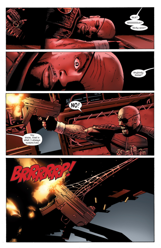 How you can copy photos and come out with such wildly unnatural looking people is really beyond me. After an underling says they have eyes on everyone but Spider-Man, Nick Fury goes to talk to his mysterious co-conspirator.