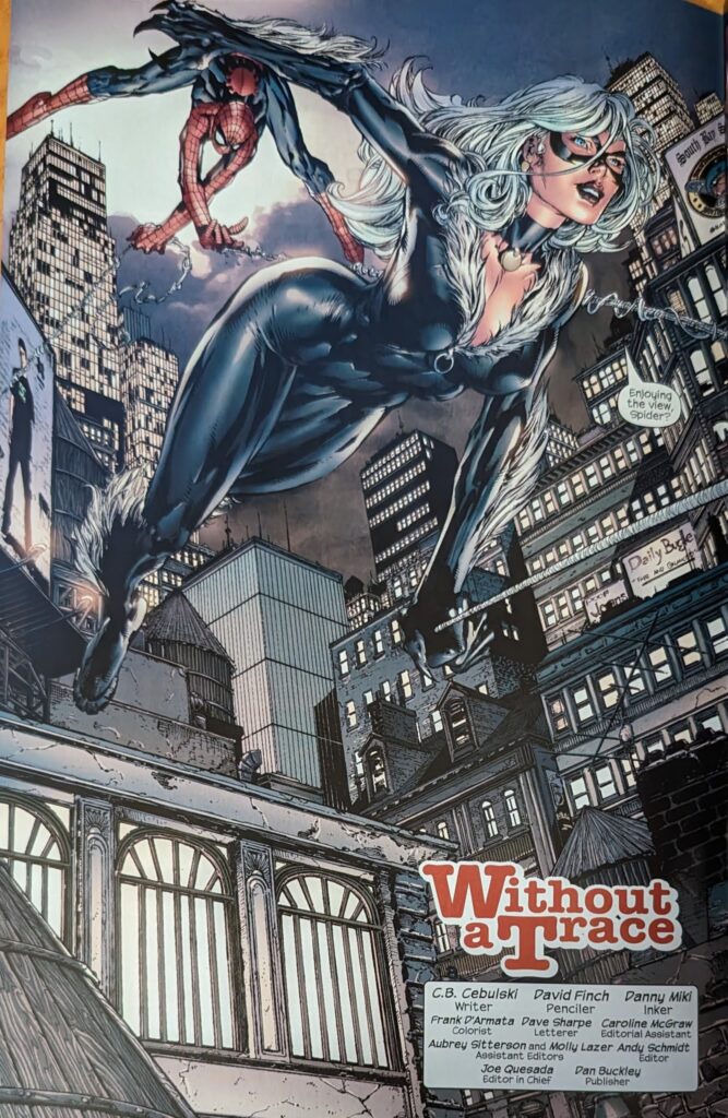 Terrible dialogue. It’s a good thing Cebulski’s mostly an editor. Spidey and the Cat fight Doom for 2 pages, Cat is able to pry his mask off, and then Spider-Man punches his fist right through Doom’s head. THEN he learns it was a robot. Which… certainly asks some questions about his technique. But, anyway, Doombot is down. Spider-Man makes two Star Wars references on the same page as Felicia gets into a safe. Spidey demands to know what was in it.