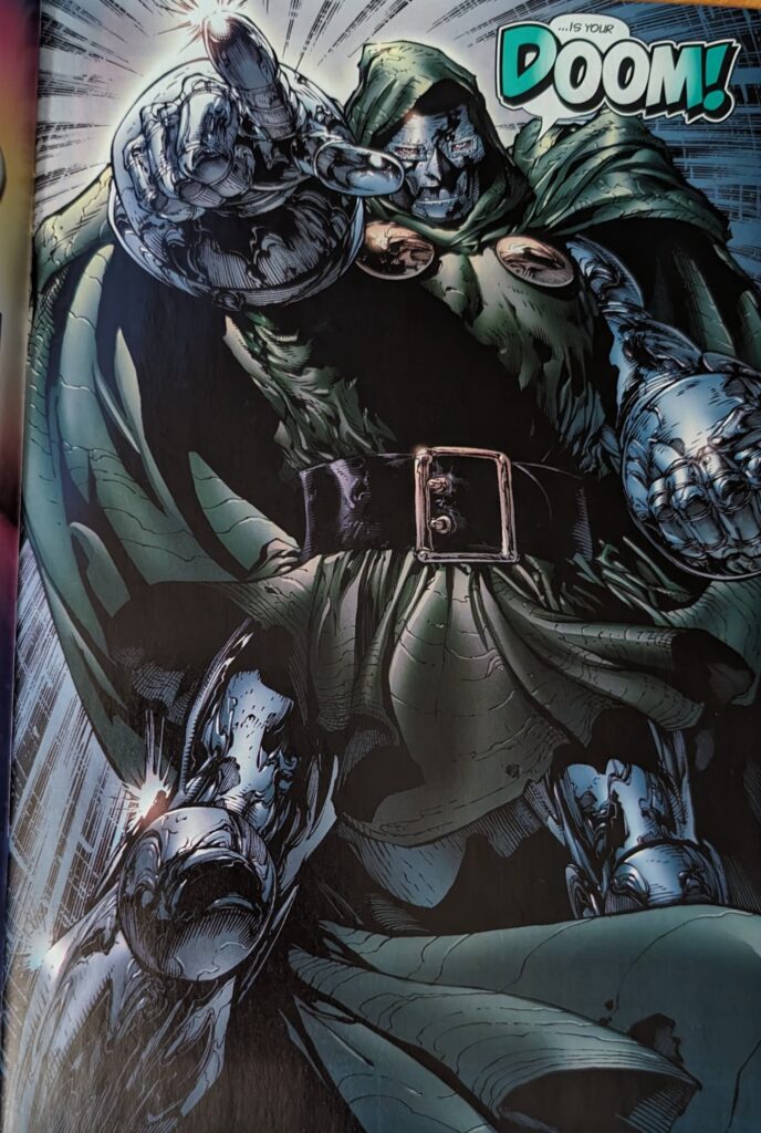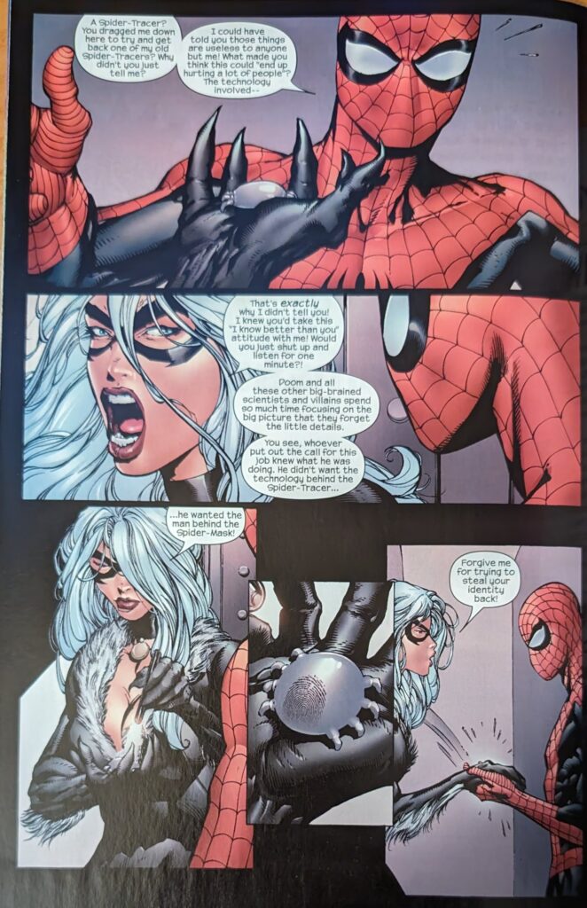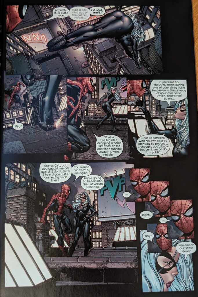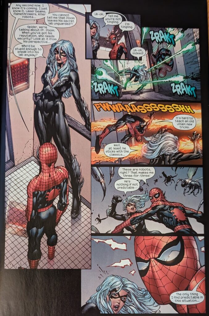 It’s weird that 2000s comics are more progressive in many ways, and really backslid on female representation. Cat is saying Spider-Man agreed to repay her for helping with that stupid Mark Millar business breaking Osborn out of jail, “no questions asked,” and this is it. An object in the Latverian embassy that could be very dangerous if it stays there is also a big payday for Felicia. This whole thing of her returning to the life of crime she basically never had in the first place is so jarring. More objectification follows as Spider-Man agrees to go with her, and still more as Felicia cuts a hole in a window into Doom’s bedroom. But, Dr. Doom is literally trapped in Hell at the moment, so he’s not liable to know. Felicia finds a secret elevator, there is more innuendo, and they’re on their way.