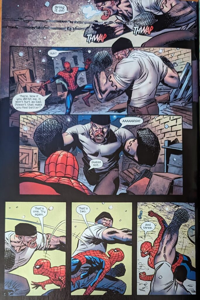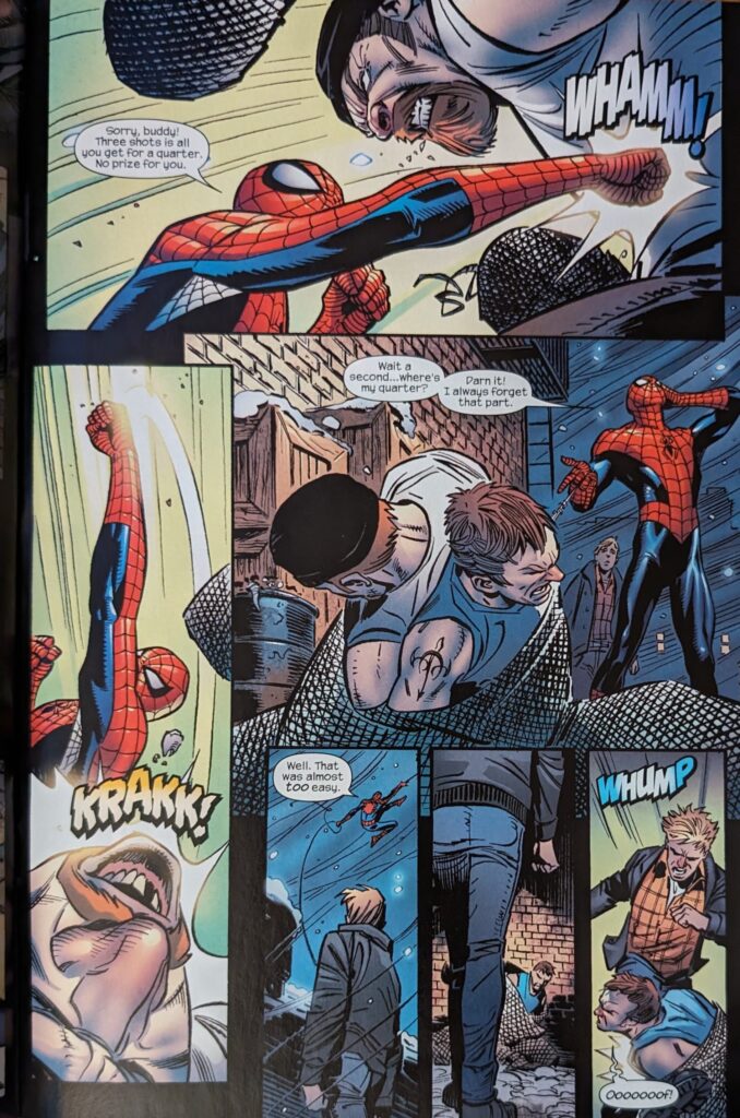 It seems very weird that two in-demand Marvel artists like David Finch and Ron Garney were allowed to do a couple of random shorts in SMU, but here we are. They’re certainly why I picked up this issue, the last of the run that I bought. Well, that at Dr. Doom on the cover. The best villain in comics running into Spider-Man is always worth a look. The first story is drawn by Finch and written by CB Cebulski, who I think I have mentioned elsewhere. Current Marvel Editor-in-Chief as of this writing, the brief bio he provides on the credits page pretends he’s just starting out as a writer, because his pretending to be a Japanese guy named “Akira Yoshida” to write Marvel comics on the side of his editing gig had not yet been exposed. Wild stuff. Well, Cebulski’s story with Finch, Danny Miki and Frank D’Armata, the new Avengers art team, begins in a manner pretty typical of the period: